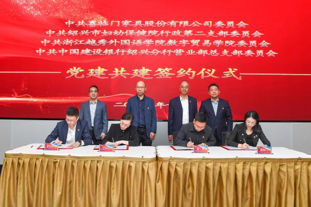 在与会人员的共同见证下,喜临门家具股份有限公司党委、绍兴市妇幼保健院行政第二支部、浙江越秀外国语学院数字贸易学院党委、中国建设银行绍兴分行营业部总支部负责人于现场签署了《党建联建协议书》。这标志着未来四方将整合各自的优势资源,达成资源共享、优势互补、协同发展的目标,亦是对党建引领业务发展模式的切实实践。相信未来各方将以此次联建为开端,在组织建设、人才培养、课题研究等领域展开更为深入的探索,着力将党的政治优势与组织优势转化为校企党建联建的发展优势,切实达成以党建为引领、以资源共享为基础、以发展共赢为目标的愿景,为学校的高质量发展注入持续不断的动力。
